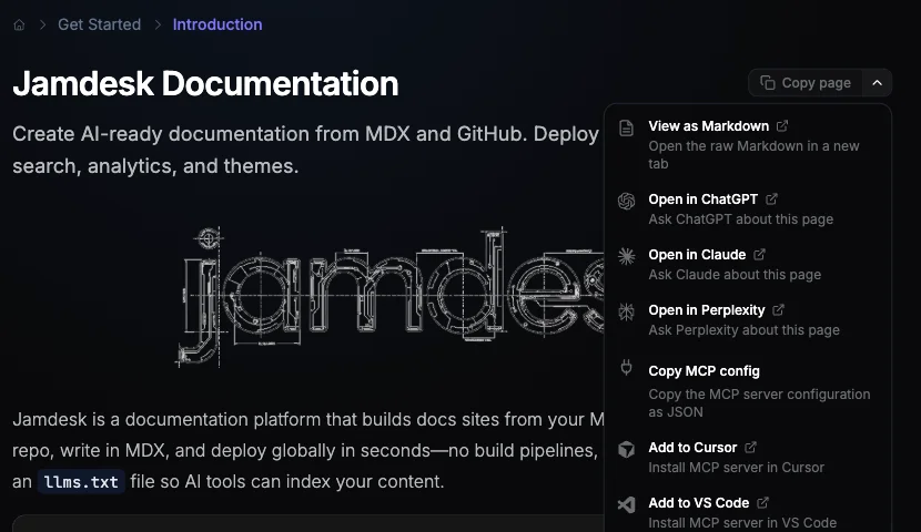 Every page on your Jamdesk site includes an AI Actions menu — a small dropdown above the title that gives readers quick access to AI tools. Copy the page as Markdown, open it in ChatGPT, install your MCP server in Cursor. No configuration needed.